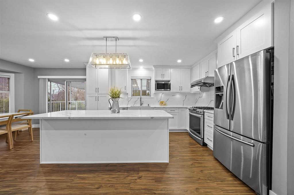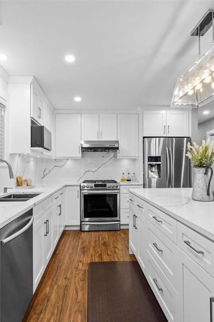 An impressive transformation of this 2600 square foot living space, started with a fresh floor plan to maximize flow and function. Keeping with a modern white shaker cabinetry theme throughout, we paired it with a dark tone flooring for a sharp contrast.